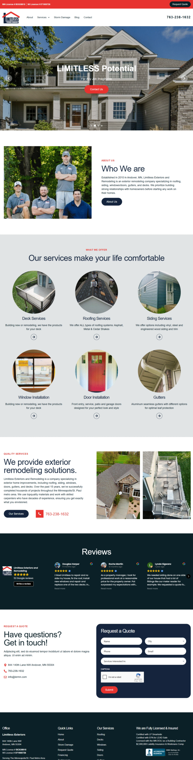 Limitless Exteriors specializes in roofing, siding, and exterior home improvements across Minnesota. Their old website had become stale and no longer reflected the company’s evolving brand or services.