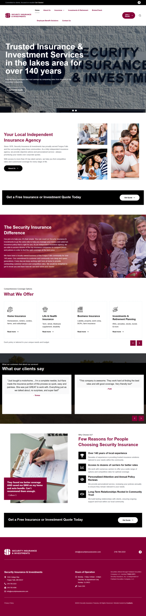 Security Insurance, a trusted independent insurance agency in Minnesota, needed a digital presence that matched the quality of their service. Their old site was clean but outdated, with limited functionality and minimal SEO benefit.